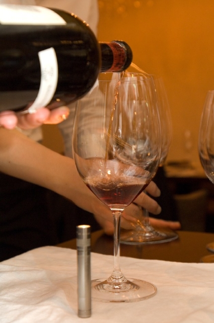 ラフィットは、松原さんにより、細心の注意を払って慎重に―あまりにゆっくりなので「腕が保たない!」と悲鳴を上げたほど―10杯のワイングラスに注がれ ました(デキャンタージュはしないと事前に相談して決めていたので)。香りをかぎ、色を見るFaustたち。褐色がかった深いルビー色とでも言いましょう か。