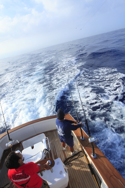 F:うーん、そうだなあ…。日本の大会だとけっこう他の船が釣れて自分たちがダメだと皆イライラしちゃうというか焦っちゃうようなムードになるんですよね、実は。でもこのトーナメントではそんな雰囲気にならない。経験豊富なアングラーが集まってるせいかな。皆どーんと構えて、とにかく楽しんでる。実際のところ、焦ったって釣れるわけじゃないですからね。それから、ハワイの海が穏やかで明るいのも、気持ちに大きく作用してると思うな。日本の海はもっと荒々しい感じだから、釣る方も悲壮感が増すというか(笑)。