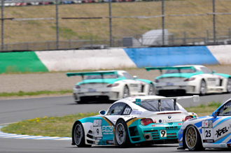 1周目、2コーナー。堀の後ろにいたポルシェは、その立ち上がり加速であっという間に堀のインに。3コーナーでは並ぶ間もなく交わされてしまった。初戦富士でのポルシェの速さは並ではなかったが。ここ、もてぎでもそのスピードは強烈。コーナリングマシンのZ4とは対照的な性格だ。
