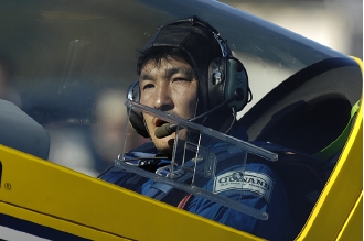 カリフォルニアのエアロバティックス競技大会を経験し、その後はこの日に向けてできるだけ時間を作っては富士川滑走場を訪れ、トレーニングを積んできたという。そして2週間ほど前に機体を「ふくしまスカイパーク」へ移し、彼自身は一週間前に現地入り。アドバイザーである室屋氏の指導の下で調整を行っていた。