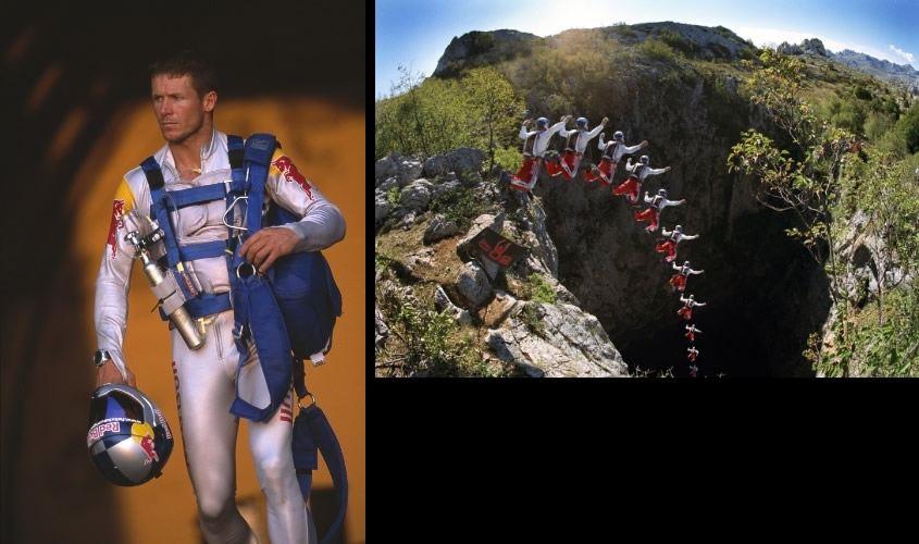 彼の快進撃は、1997年、アメリカで開催されたベースジャンプの世界大会で優勝に輝いてから始まります。99年には、当時世界一の高さを誇ったマレーシ ア・クアラルンプールのペトロナス・ツイン・タワーからジャンプ(451m)。さらに半ば呆れてしまうのは彼の選択です。まるで「ジャンプ場所は高ければ いい訳ではなく、危険であるほどいい」と考えているかのように、同年には、リオ・デ・ジャネイロのキリスト像の手のひらの上から、世界一“低い”ジャンプ も実現しています(29m!)。