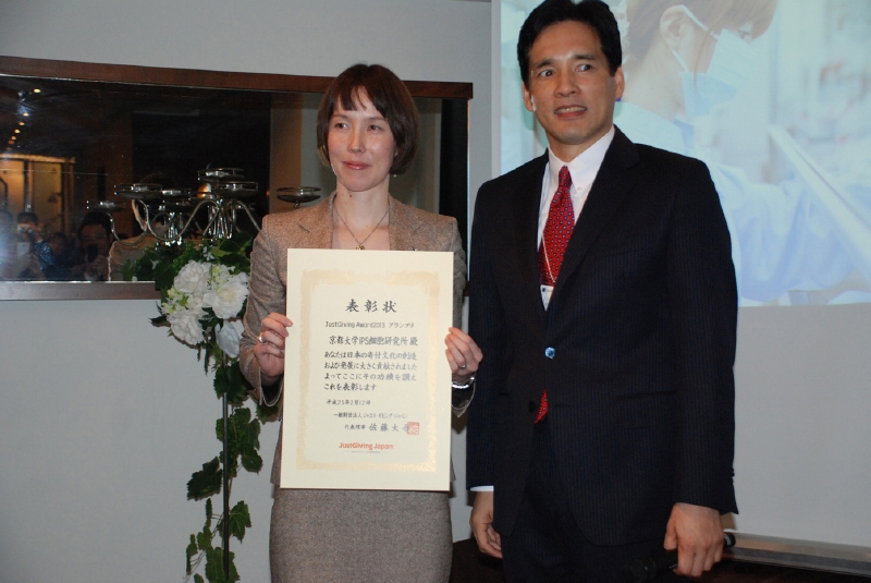 「JustGiving Award 2013」グランプリを受賞したのは、2012年ノーベル医学・生理学賞受賞の山中伸弥教授率いる京都大学iPS細胞研究所。山中教授が自ら研究費用を集めるためにJustGiving上で昨年3月11日開催の京都マラソン完走というチャレンジを宣言したことに端を発し、同サイト内で支援を訴えた結果、現在までに総額2000万円以上という、当初の目標金額の201%という達成率の寄付金が寄せられた。